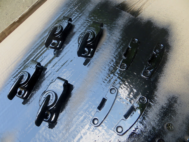 I cleaned the hardware with rubbing alcohol and a stiff brush. I don’t know what the gummy mess was on them but it rusted the pieces.