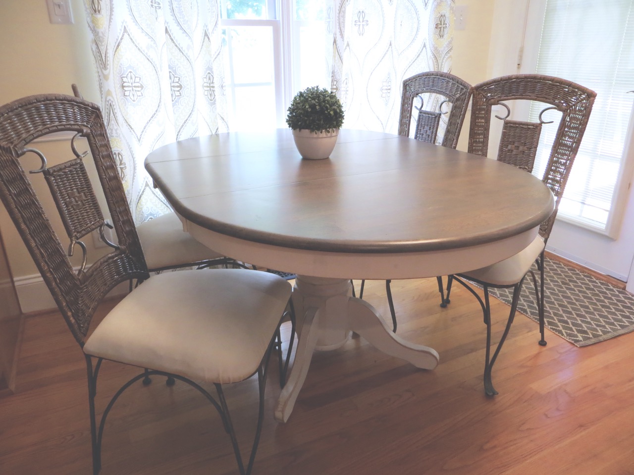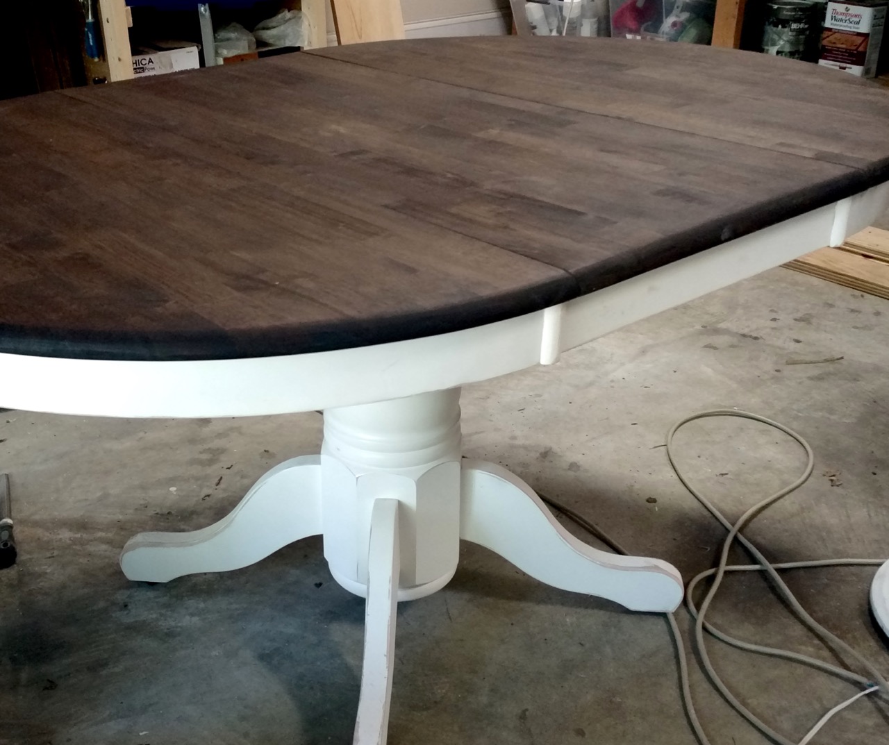 Here’s another example of a table refinish! Isn’t it amazing!? I helped a friend a few years ago and it took us about 2 hours of sanding and cleaning to prepare for paint and stain. We used two coats of white latex paint for the legs and Minwax Dark Walnut Stain for the top, and finished it off with a topcoat.