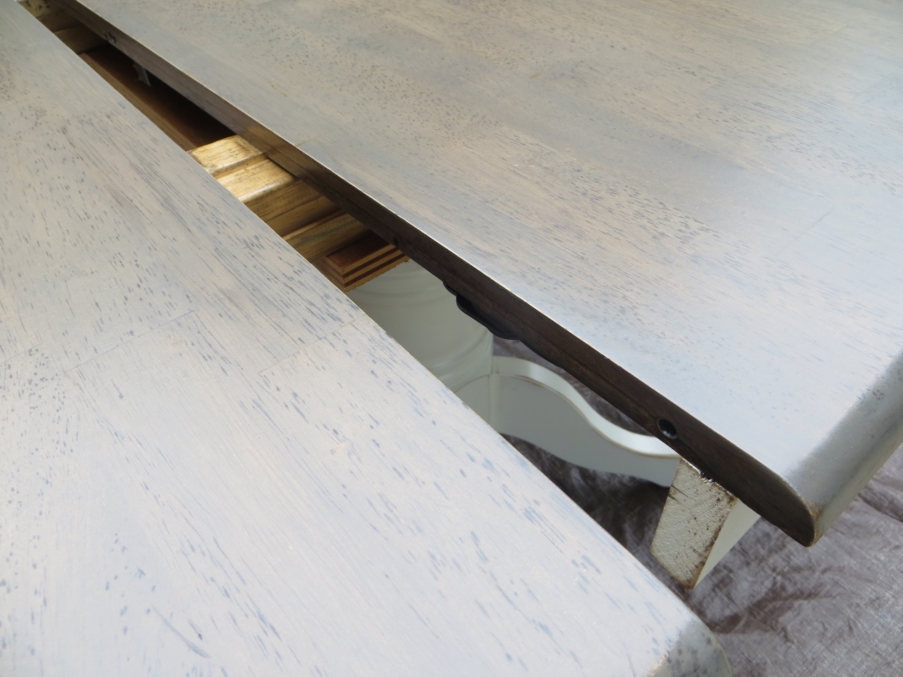 I used 80 to 150 grit for the top. For the white base I used 220 grit to simply buff out any scuffs and stains. I still wanted a worn look which it had – I just wanted it more polished.