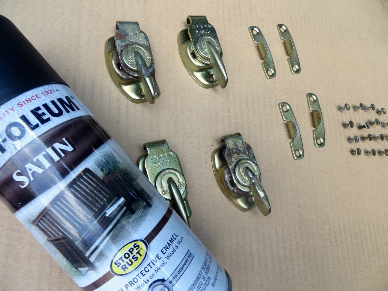 I cleaned the hardware with rubbing alcohol and a stiff brush. I don’t know what the gummy mess was on them but it rusted the pieces.
