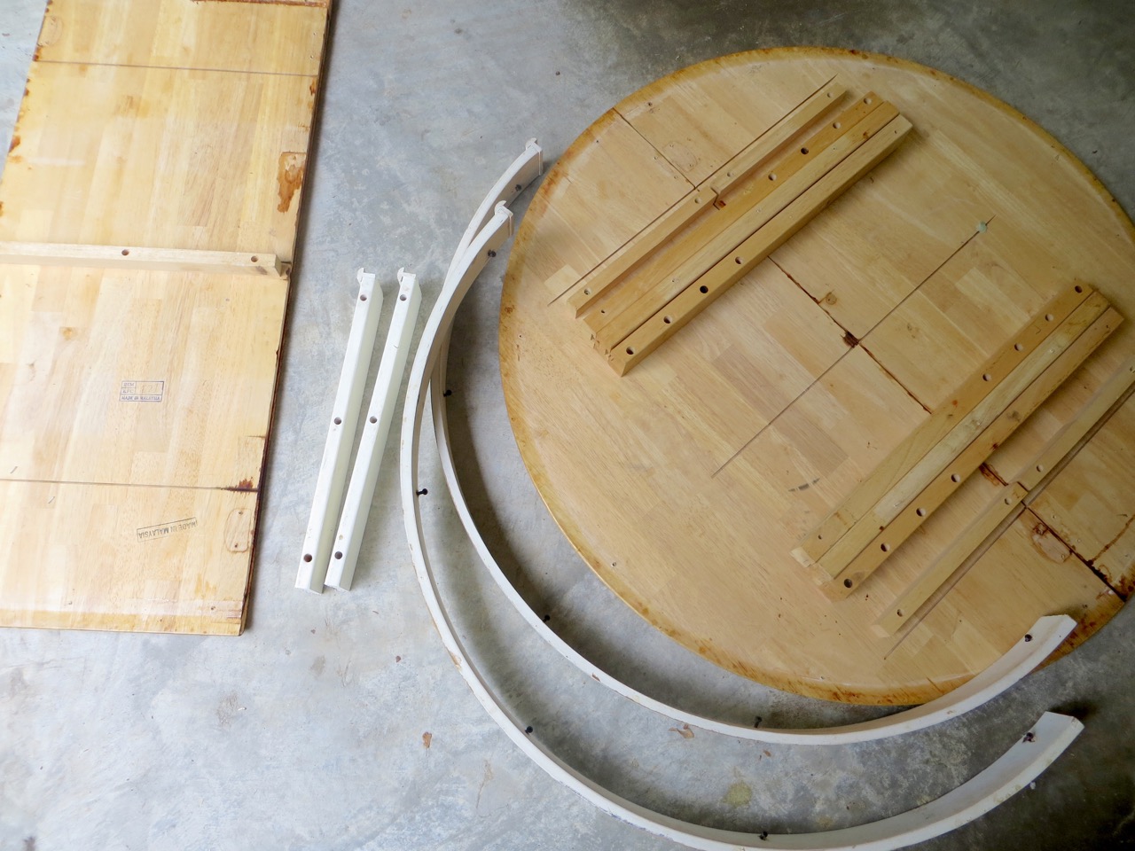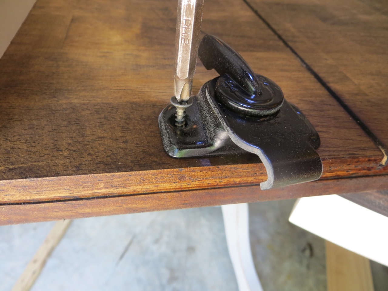Once the stain was dry I assembled the table back together. The easiest way was to have the trim pieces lifted so I could guide the screws back into the right hole on the table top.