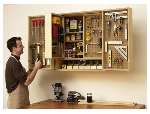 I had tools scattered around the house and it was driving me crazy! I looked online for peg storage systems and came upon this downloadable building plan for a tool cabinet system (shop-in-a-box) on Amazon (now available here).