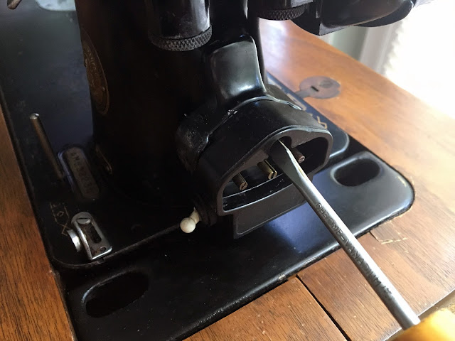 Hold the black washer in place as you screw the silver knob into place. Once tight, you can screw the small screw on (this doesn’t need to be too tight – it’s just a little stopper when you release this knob for winding a bobbin).