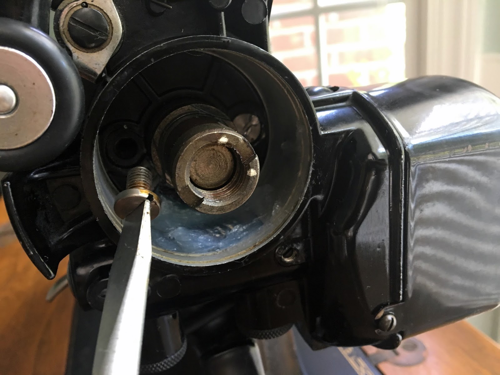 Hold the black washer in place as you screw the silver knob into place. Once tight, you can screw the small screw on (this doesn’t need to be too tight – it’s just a little stopper when you release this knob for winding a bobbin).