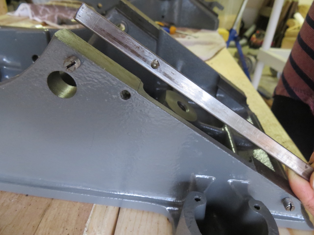 …insert your gib bar inside the dovetail way and move it back/forth until you can locate the impression on the bar through the gib screw hole (you’ll want a flashlight).