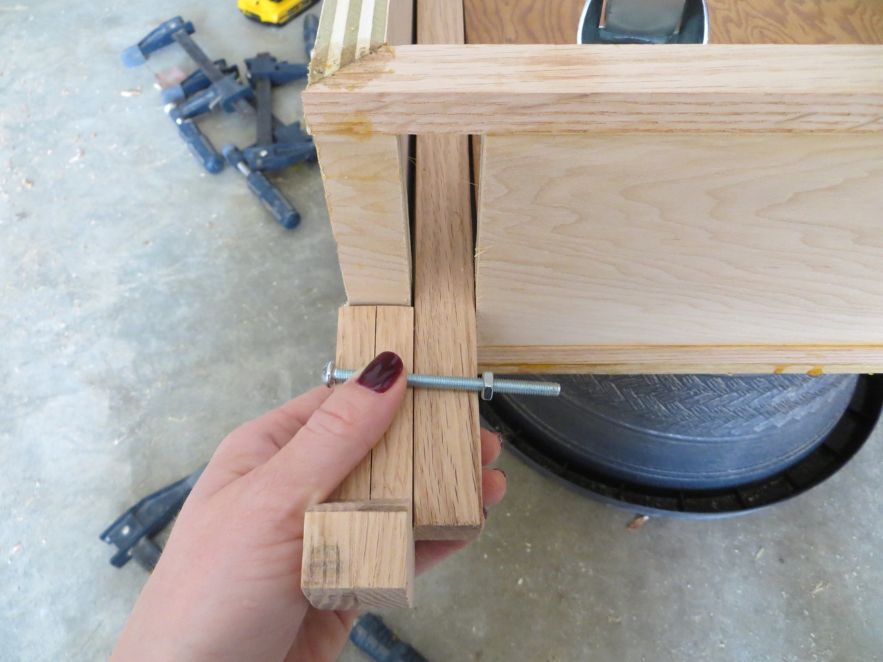 Once the arm was bolted to the caster boards and extending out I worked on the pedal. Here I’m measuring how long to cut the bolt.