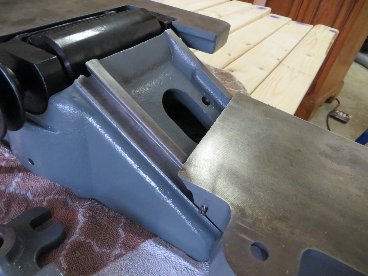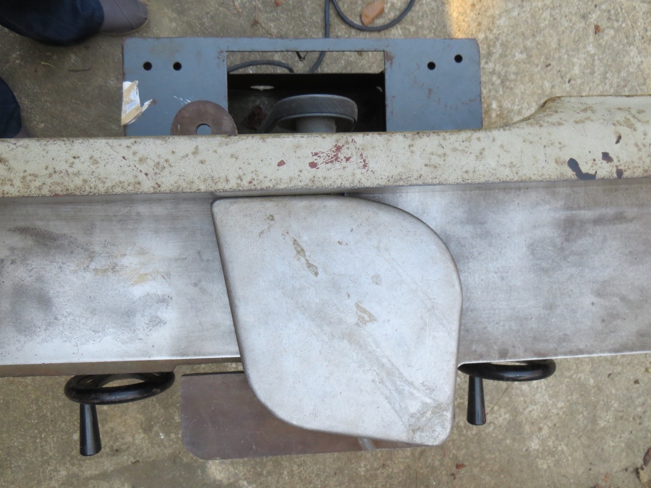 When I first got the jointer home the tables sagged really bad – probably from all the gunk in the dovetail ways that interfered. I used a long straight metal edge to see and adjust the sagging (which was minimal) by adjusting the gib screws. It’s amazing how a slight turn of a little screw will raise/lower a huge-heavy table!
