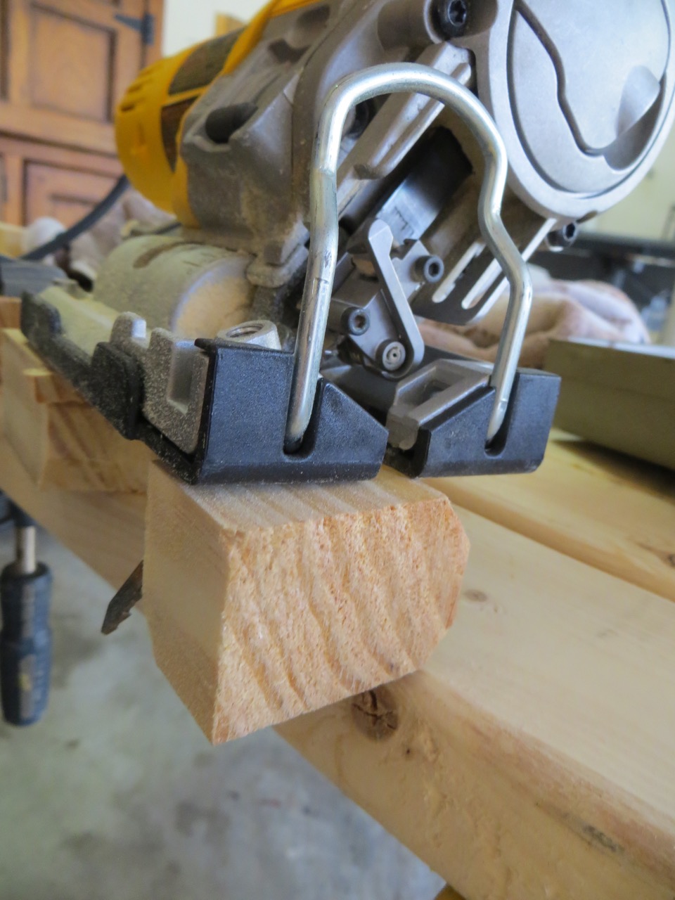 I don’t have a bandsaw so I made use of my jig saw! First I cut out the rough opening of my handles then I adjusted the base of my jigsaw so it was slanted…