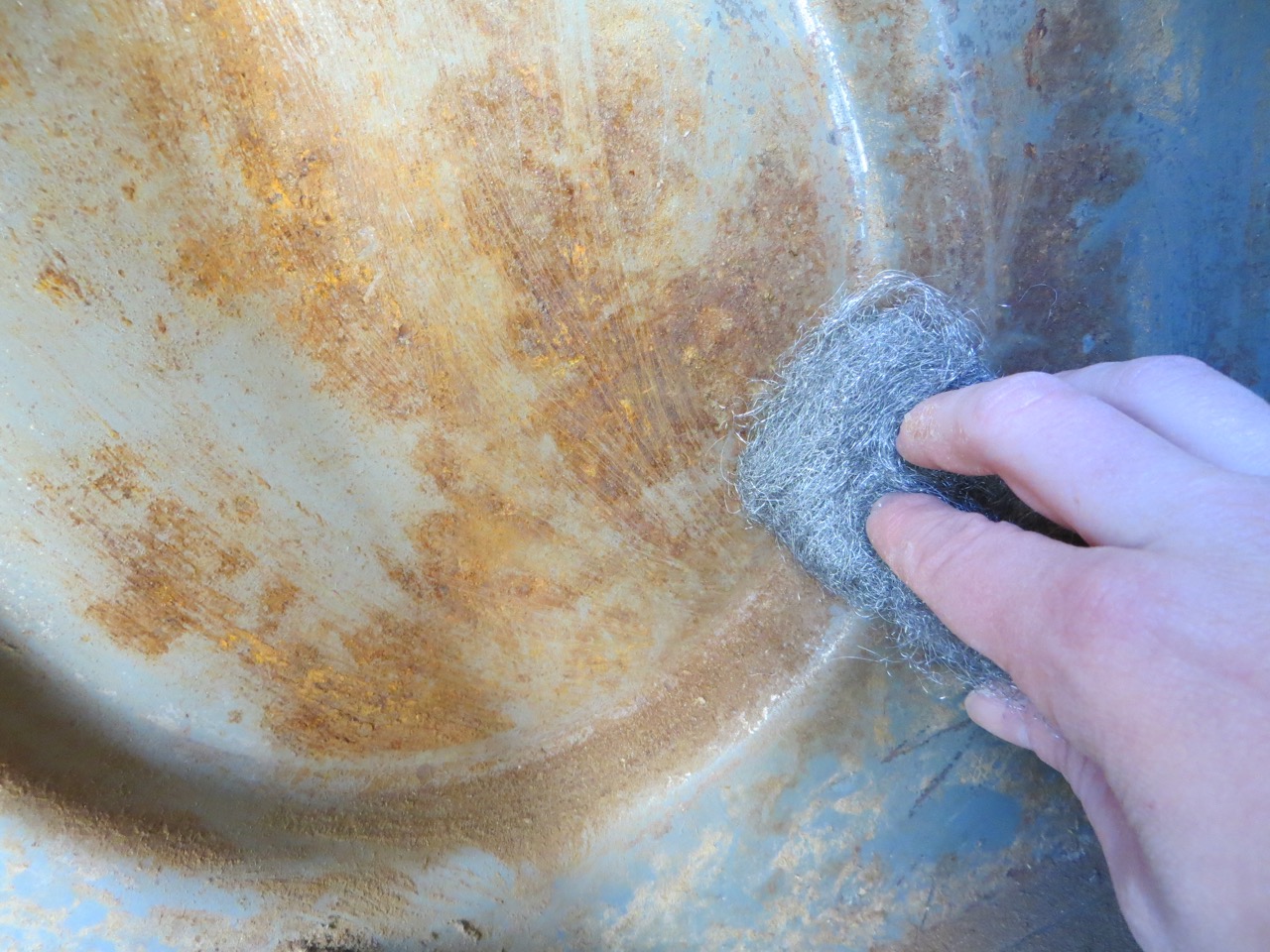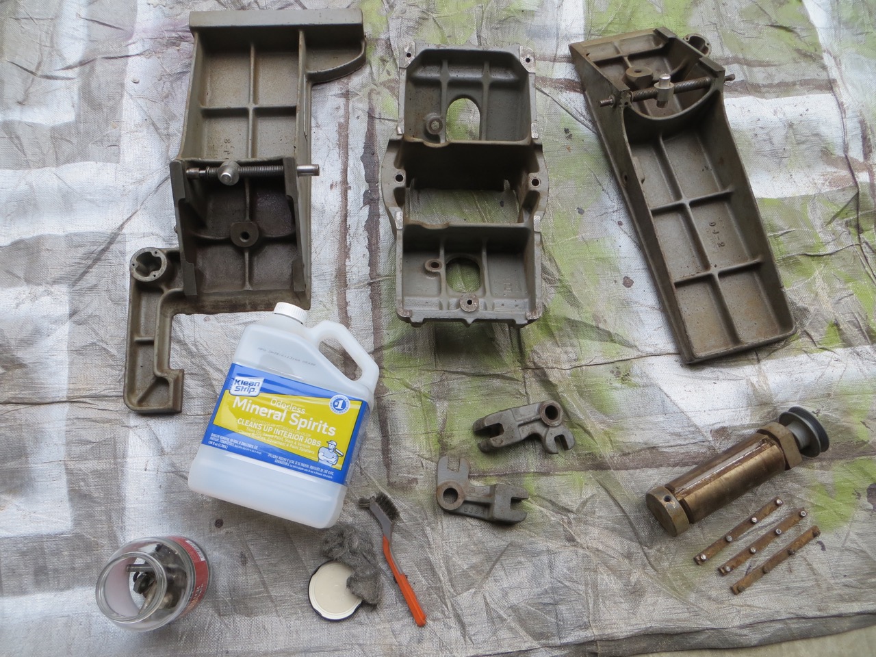 I used mineral spirits to clean and de-gunk everything. I soaked a large piece, scrubbed and scrubbed, wiped off with towels and ‘rinsed’ residue with more mineral spirits. Work on one piece at a time. TIP: Use heavy-duty rubber gloves with the mineral spirits and I HIGHLY recommend goggles! I wasn’t wearing eye protection and a bit of mineral spirits/gunk flung into my eye as I was scrubbing so I had to rush inside and flush my eye out!