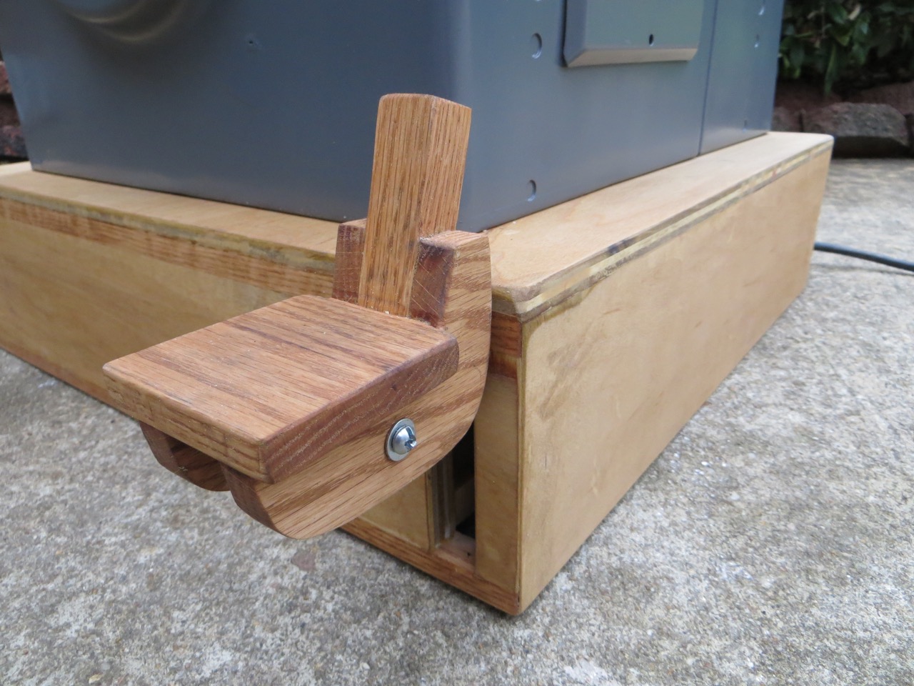 I made a caster base for the jointer. I love how the caster wheels are activated with a simple pedal! Even without the casters I would have wanted a base to raise the jointer because it seemed unusually short and I’m only 5’7″. I made the wooden base almost 2-inches bigger on each side and the front to stabilize the jointer more-I was really surprised how unstable it felt, especially with how front-heavy it was!
