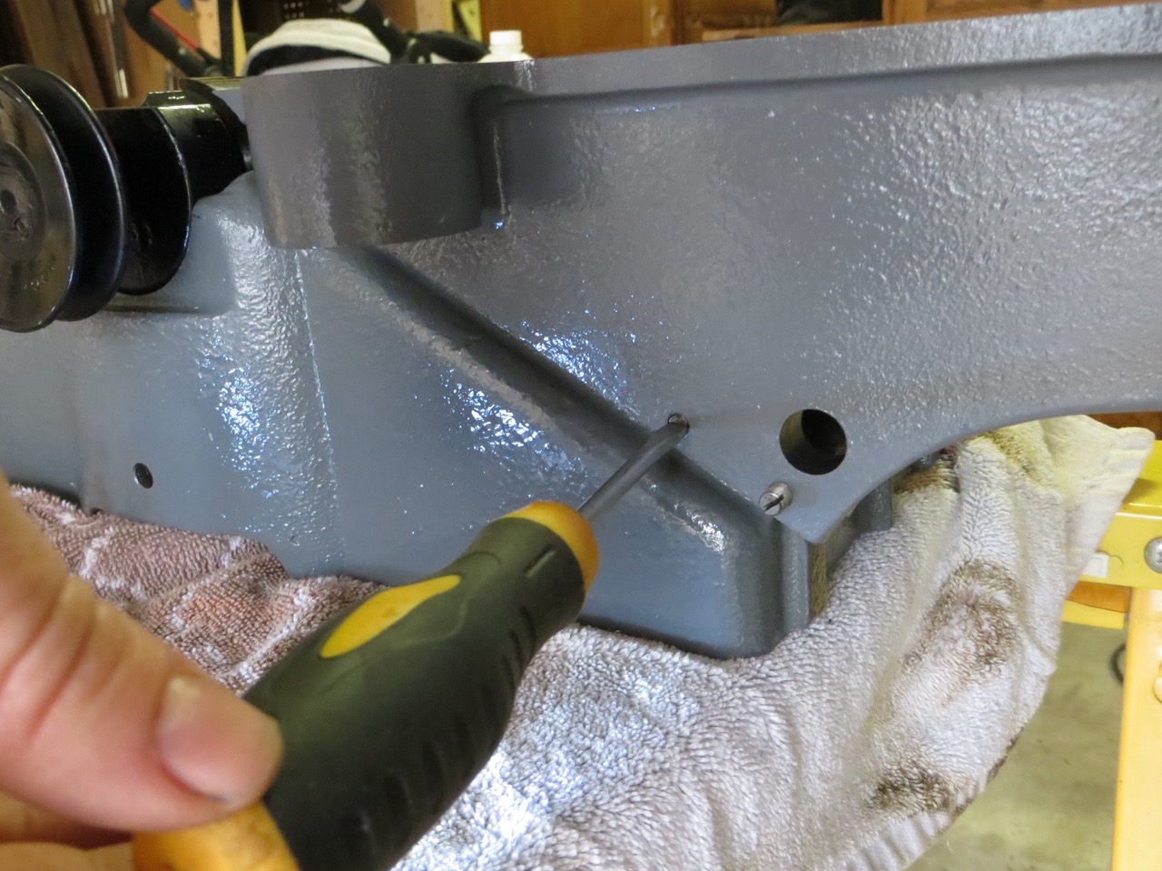 Without moving, very carefully screw in that last gib screw. You want this screw somewhat tight; tight enough that the screw keeps the gib bar in place as the table is adjusted up/down but loose enough that it’s not pinning the bar so tight that the tables are hard to move. Tighten the other gib screws (keeping somewhat loose until you can do final adjustments at the end).
