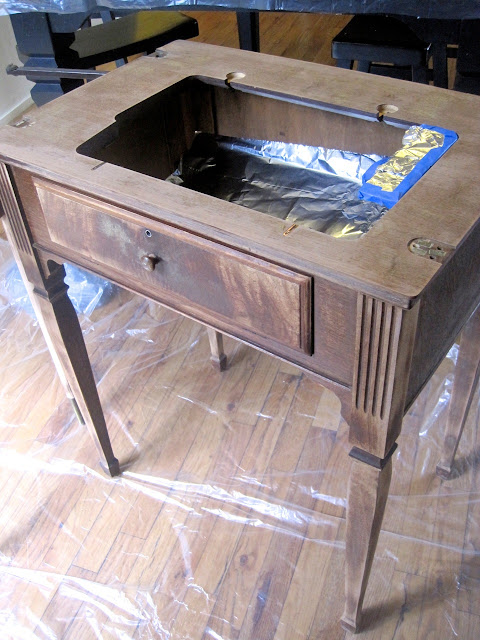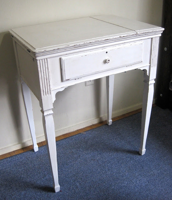 This cabinet came with a nice machine. I really liked the character and detail of the cabinet. At first I pictured the cabinet with a funky color but ended up doing a classic white with distressed look.