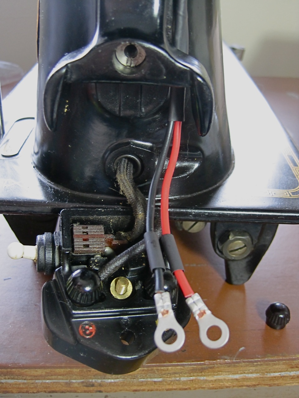 I think they came out because as I was trying to put the petal in the cabinet to use the lever to sew instead of the petal, it dropped down and hit the floor and therefore pulling on the wires. It looks to me like the guy only rewired the foot petal.