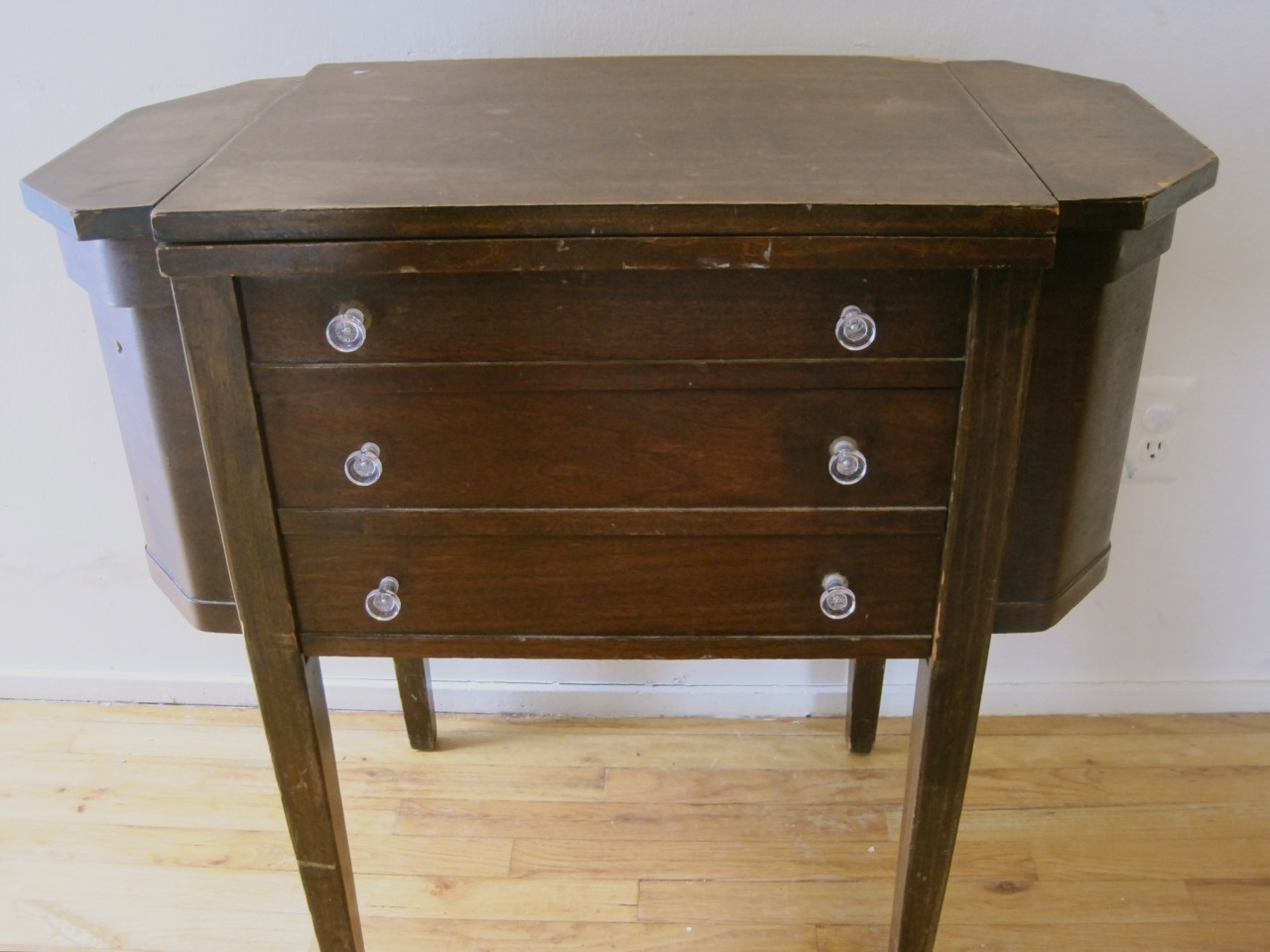 By the way, the table it’s in is a Martha Washington sewing table. Probably a reproduction – I’m not an expert so I wouldn’t know for sure, but it IS a lovely table. I have one also, it was my mother’s, but it’s not set up for a sewing machine. I’ve never before seen one that was; that’s quite a find you have there.