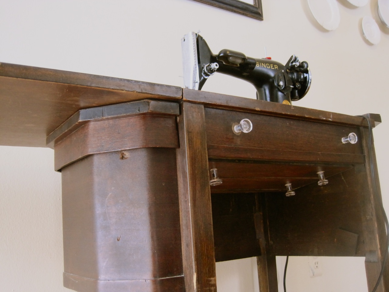 By the way, the table it’s in is a Martha Washington sewing table. Probably a reproduction – I’m not an expert so I wouldn’t know for sure, but it IS a lovely table. I have one also, it was my mother’s, but it’s not set up for a sewing machine. I’ve never before seen one that was; that’s quite a find you have there.