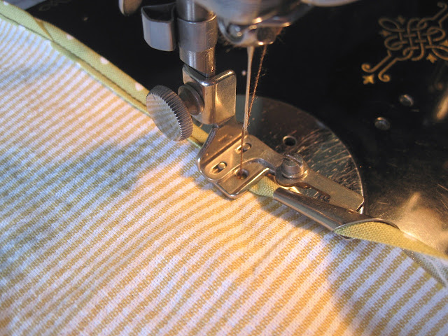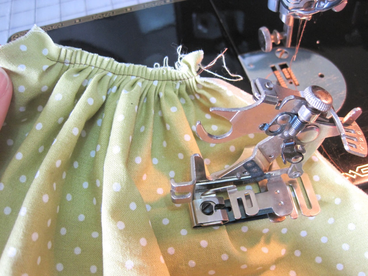 Pin-tucker. I would have never guessed what this was just by looking at it. It’s a pin-tucker! Oh how marvelous! You fold your fabric, line it up inside the attachment and sew on your folded edge, and while you’re sewing the attachment has a little metal finger that presses into your fabric creating a crease. When you’re done sewing your pin-tuck, your fabric already has a crease made for you to fold and sew your next pin-tuck – so on and so forth. This contraption is completely adjustable to how far apart you want your pin-tucks, and how wide/narrow you want your tucks sewn. I’ve done pin tucks before (on a baby tux shirt) and had to measure, mark, iron, sew for EACH pin-tuck. This is genius. I haven’t seen one of these attachments for modern machines.. have you?