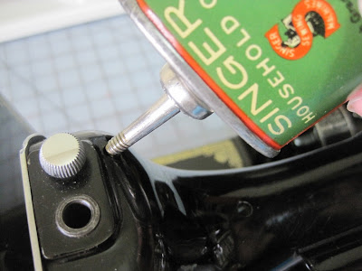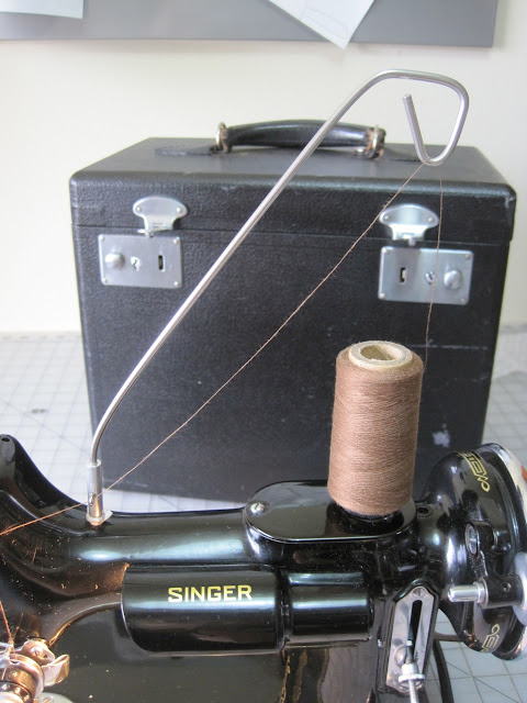 This thread stand is not a standard accessory by any means, but I had to have it because it eliminates the thread from wobbling/bouncing around on top of the machine while sewing. I read that spools of thread were wound differently back then so they could be unwound from the side, nowadays thread spools need to be unwound from the top! It fits right into the oil hole on top of the machine.