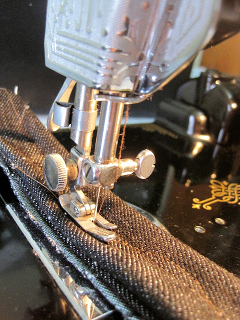 First, you need to cover the feed dogs on the machine with this metal plate that screws into the bed of the machine. Like modern machines these days, you can’t lower/disengage the feed dogs from pulling your fabric through the machine.