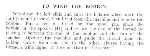 While you crank with your right hand, hold your thread with the left and move it from side to side slowly as the bobbin fills. The manual says to build up the sides of the bobbin more with thread.