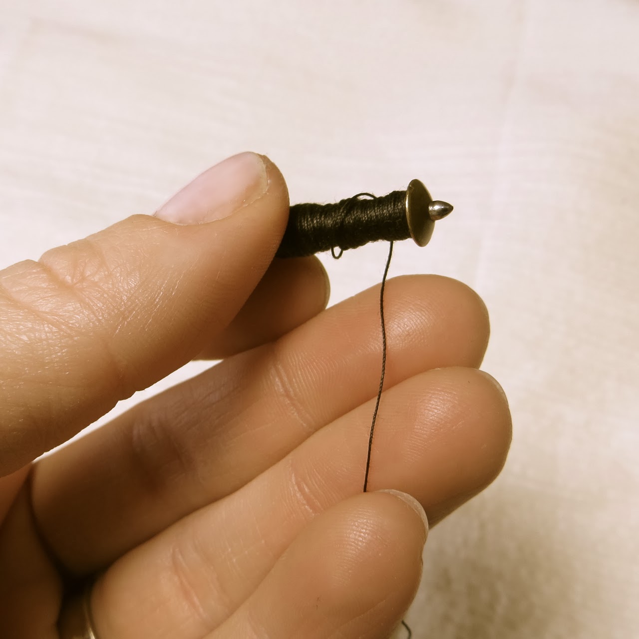 Insert the end of your bobbin into the cup of the spooler with the thread in between – this will anchor the thread when you start winding.
