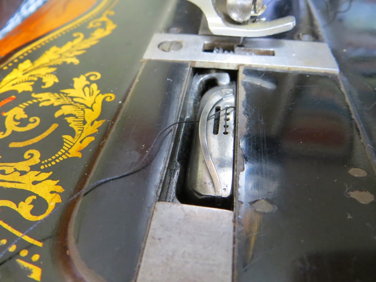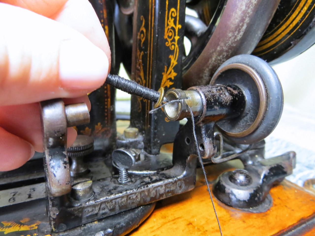 June 16, 2019 at 10:56 pmThank you for your excellent pictures on threading the bobbin in the shuttle. I finally got an 1877 model 12, with the original cabinet, coffin lid and correct shuttle. It’s in fantastic condition for being 142 years old!