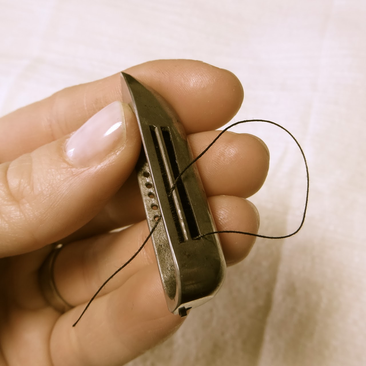 Take the end of the thread over the bobbin to the other side of the shuttle to the 2 long slots. Put it through the one on the bottom first and back through the top one back over towards the holes on the other side.