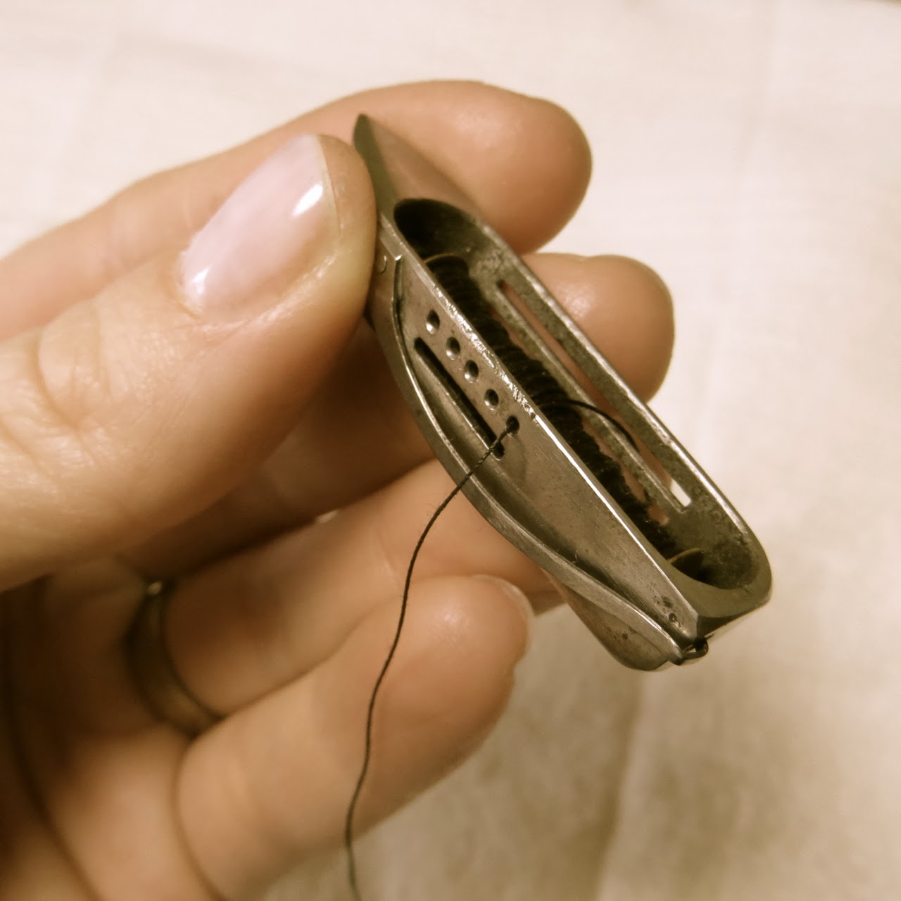 Thank you for your excellent pictures on threading the bobbin in the shuttle. I finally got an 1877 model 12, with the original cabinet, coffin lid and correct shuttle. It’s in fantastic condition for being 142 years old!