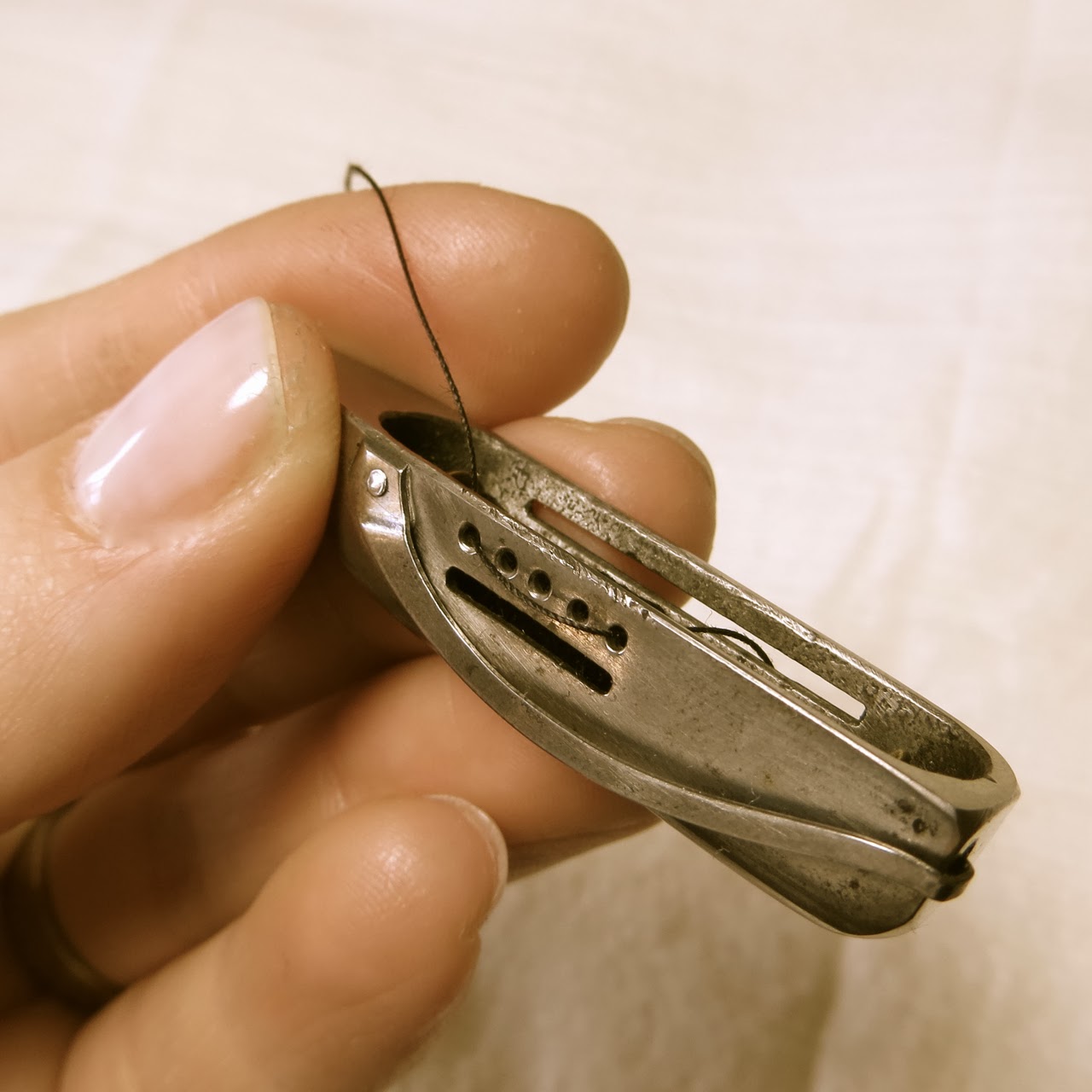 One thing to be aware of is that these machines take different needles than the universal needles modern machines take.  The are much longer and the shank is more narrow and completely round without a flat side.  These are extremely rare if you’re looking for original needles, but if you want to buy reproductions I found a lady on Etsy who sells them.