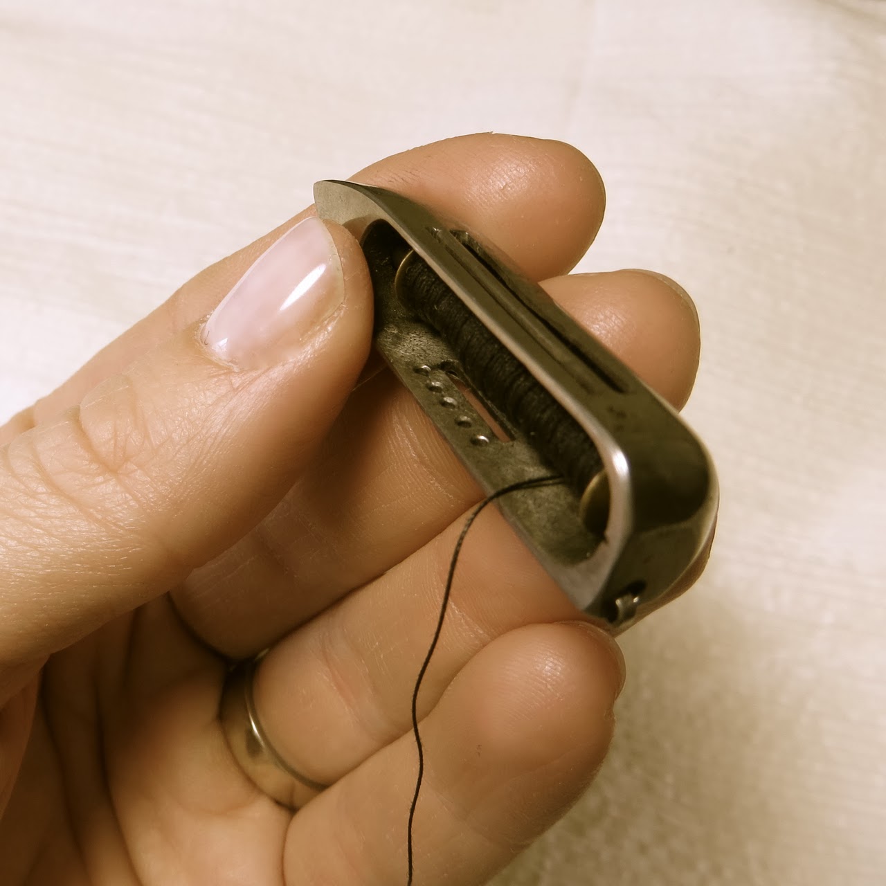 Insert it into the shuttle with the thread coming from underneath towards the small holes on the left side of the shuttle.