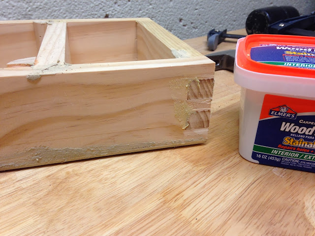 Fill in any holes or imperfections with wood filler.  Let dry.
