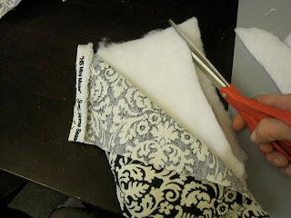 Put a line of glue along the back edge of the case and pull your fabric a little as you press it onto the hot glue. Stuff some batting into the ‘pocket’ you just made.