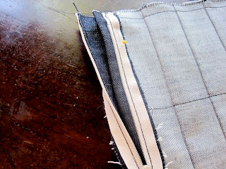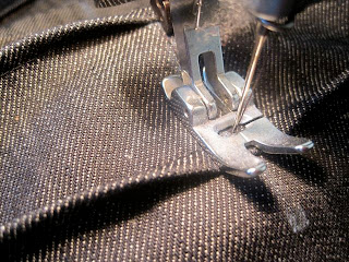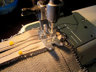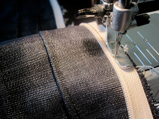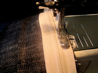 With your zipper foot, sew along pinned edge. You want to be close to the teeth of the zipper but be sure not to sew on top of them.