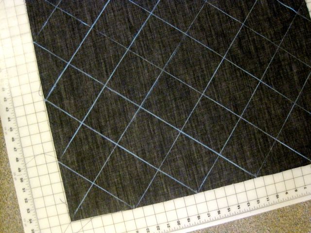Cut your fabric to be 30″W x 60″L. With you fabric marker and ruler, make 6-inch marks along all edges of fabric. Connect top-right corner with 5th mark down from the top on left side (this makes a 45-degree angle). Connect top-left corner with 5th mark down from the top on right side. Connect other lines as necessary to make diamonds.