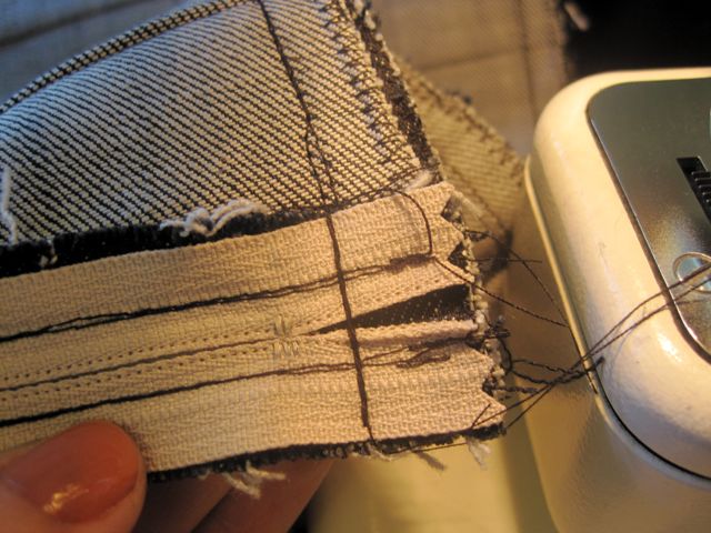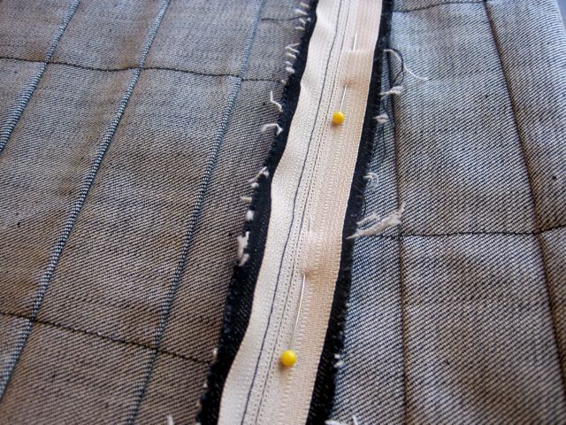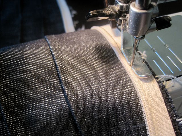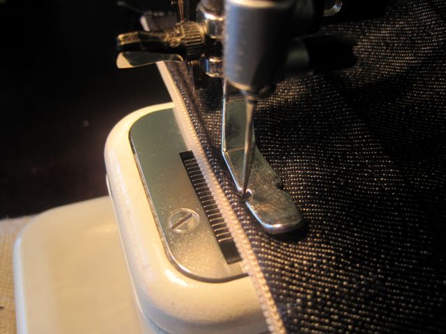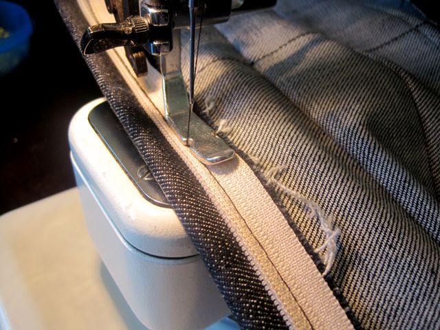 With your zipper foot, sew along pinned edge. You want to be close to the teeth of the zipper but be sure not to sew on top of them.