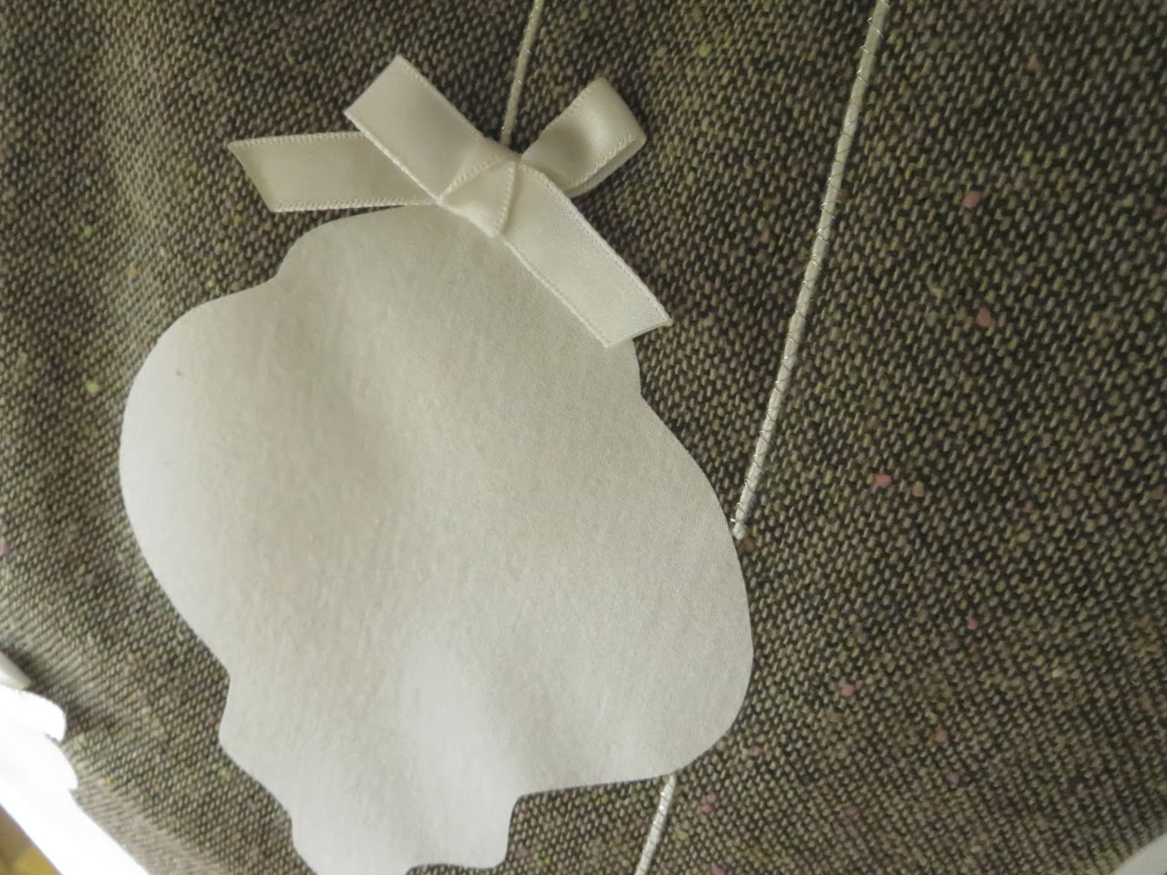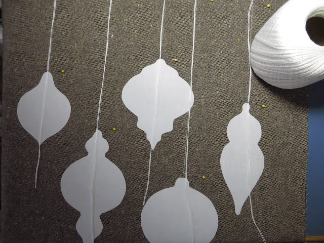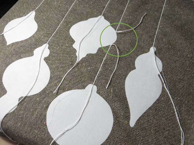 Double up strands of crochet thread and pin over chalk lines. Make sure your ends extend down past the top of your ornaments 8-inches!