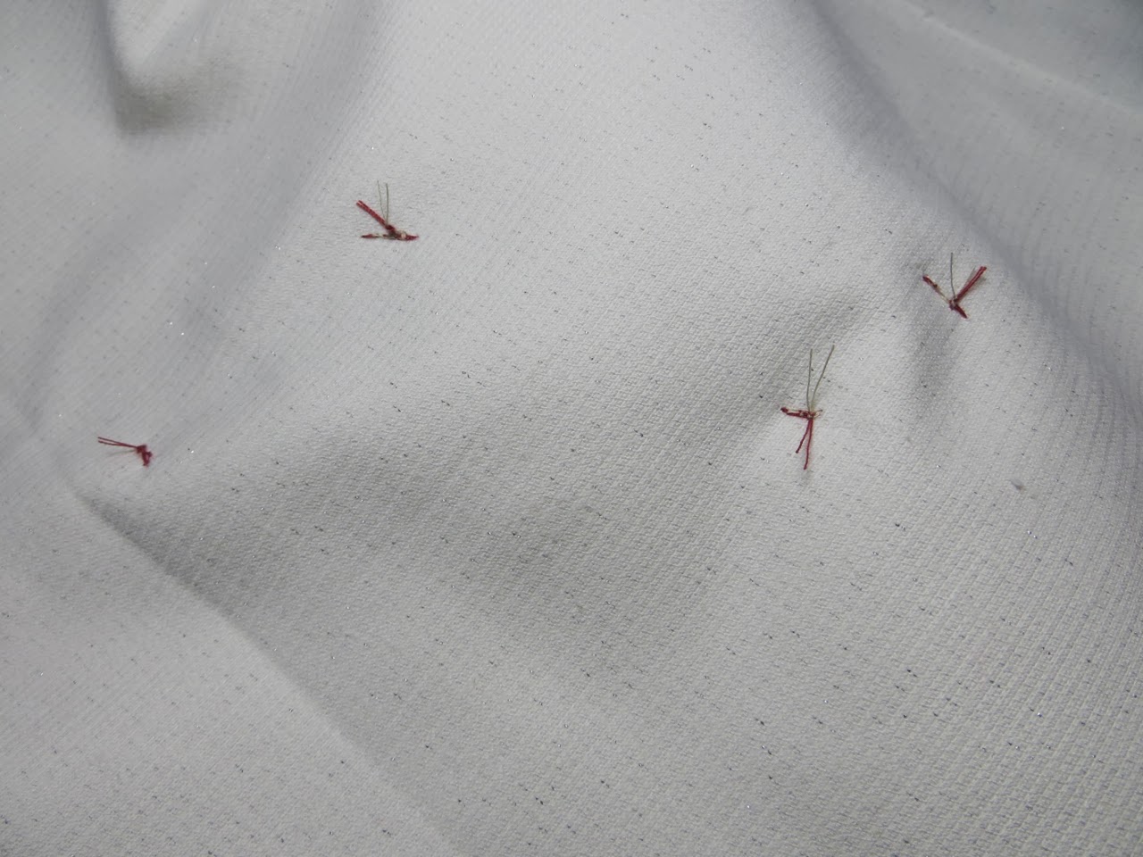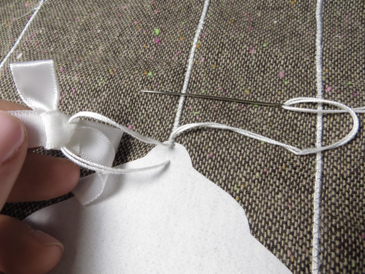 With your hand needle thread your top machine thread down to the back. Next thread your 2 crochet thread strands through your needle and go through the center of you bow starting at the top and exiting at the bottom (go through most layers to make sure your bow doesn’t pull apart). Thread your needle back down through your fabric and back up. Make another pass through your bow and maybe a last stitch going horizontal through the bow knot to keep it from pulling up on the sides.
