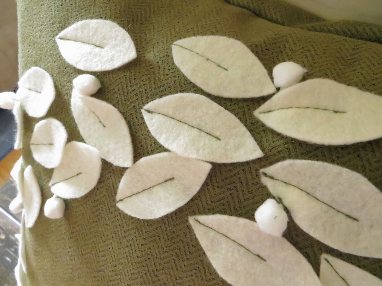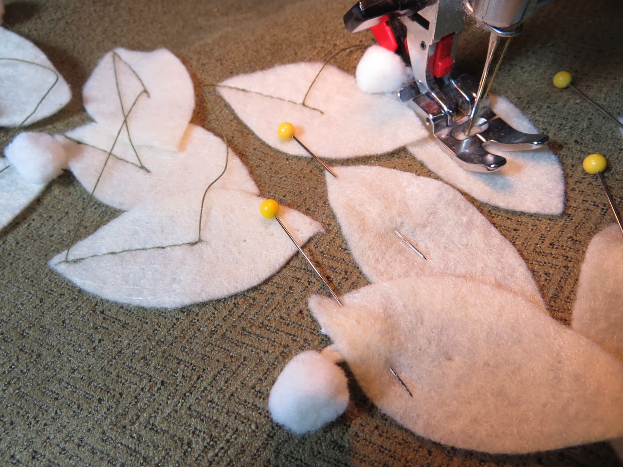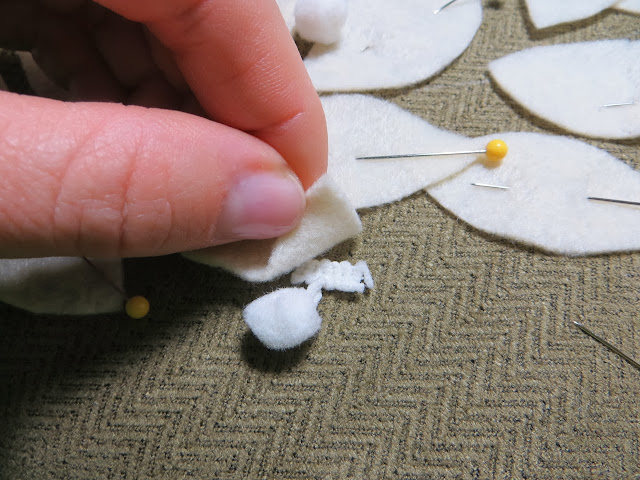 Pin your pom-pom’s so they are under your leaves. Make sure all that extra trim part is centered under your leaf where you will be stitching them in place.