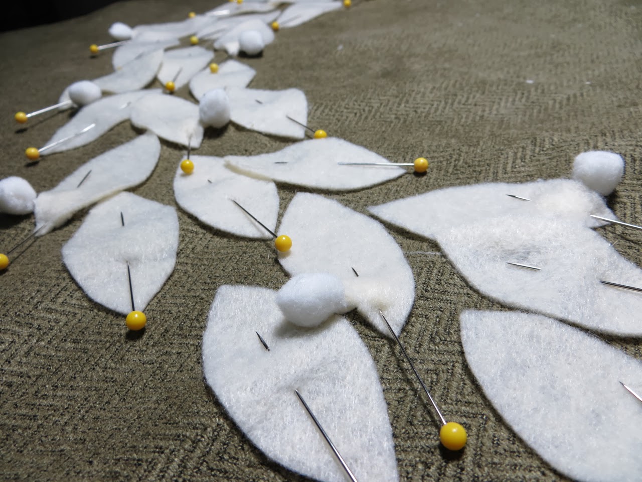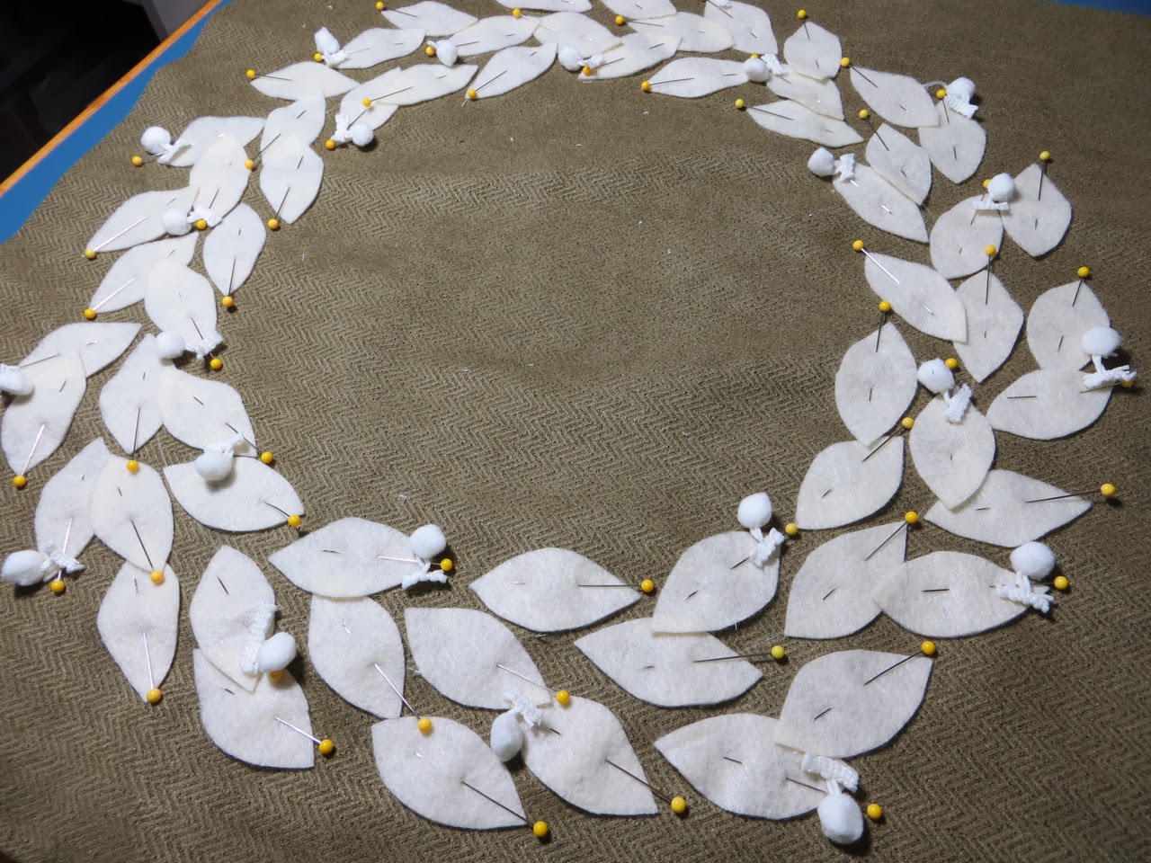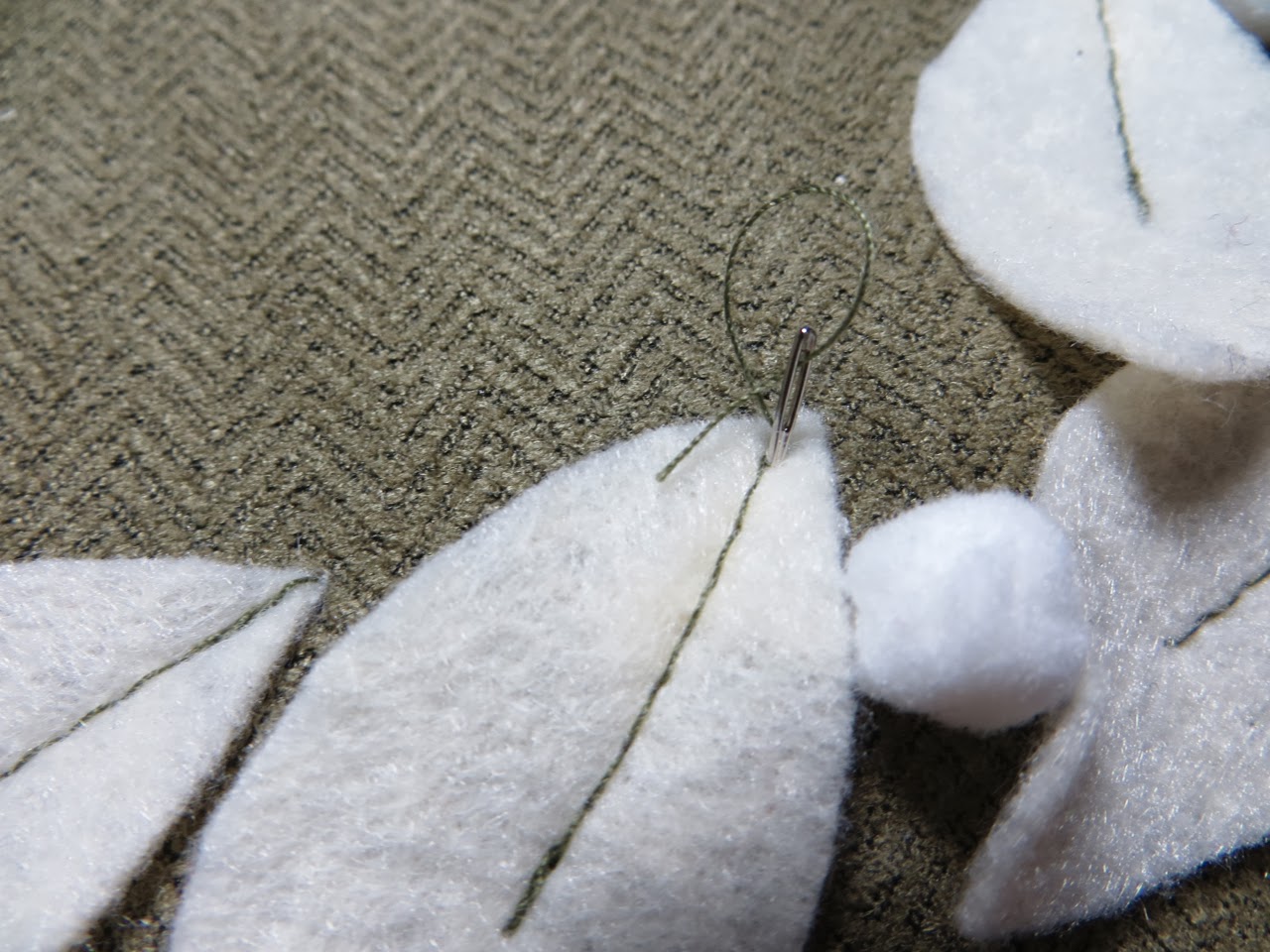 Pin your pom-pom’s so they are under your leaves. Make sure all that extra trim part is centered under your leaf where you will be stitching them in place.