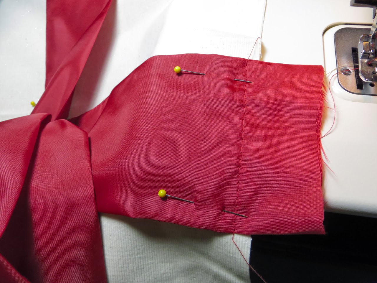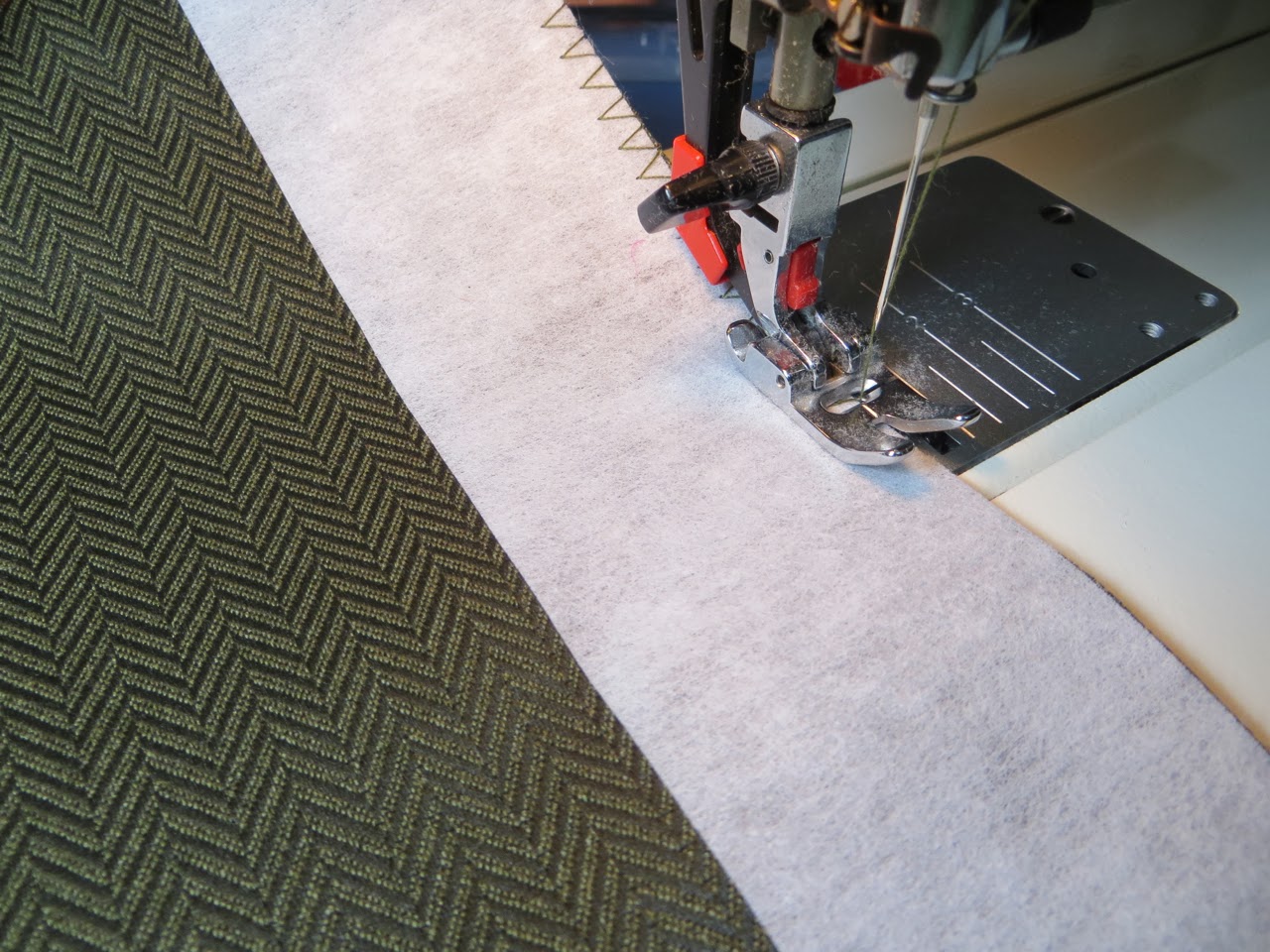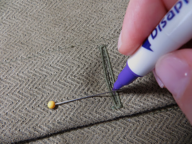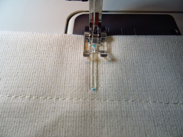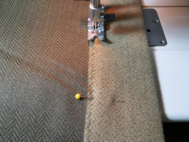 The first 2 stitches you will do are where you can see my pins in the photo above. These stitches will hold your vertical strip flat instead of wanting to scrunch up to one side.