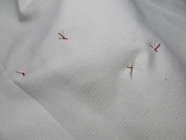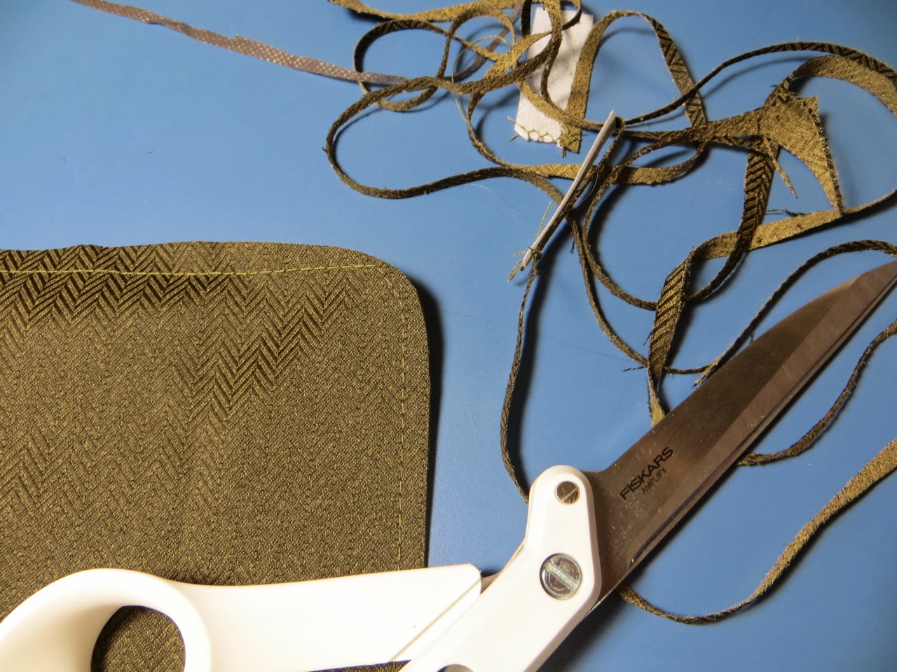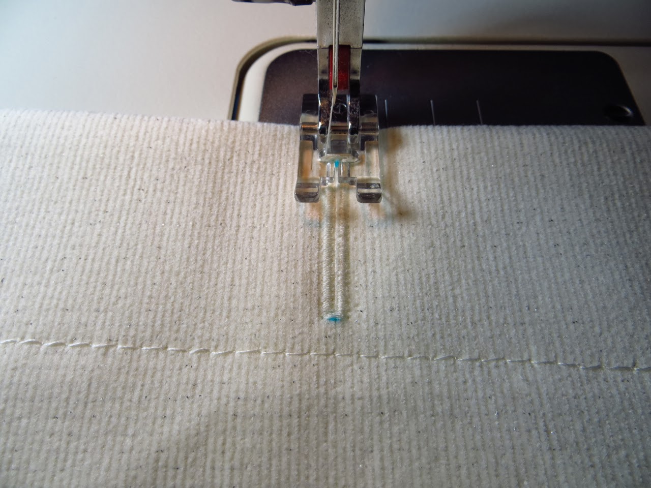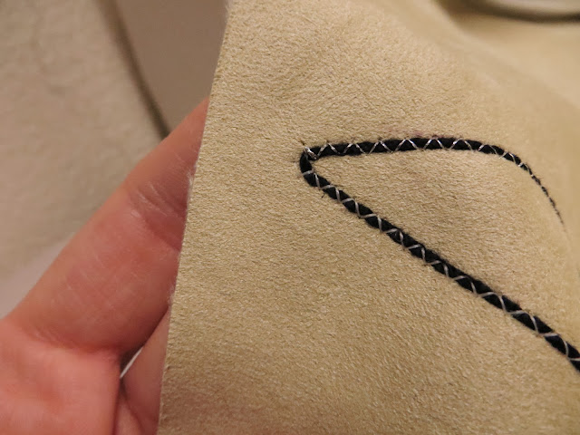 The first 2 stitches you will do are where you can see my pins in the photo above. These stitches will hold your vertical strip flat instead of wanting to scrunch up to one side.