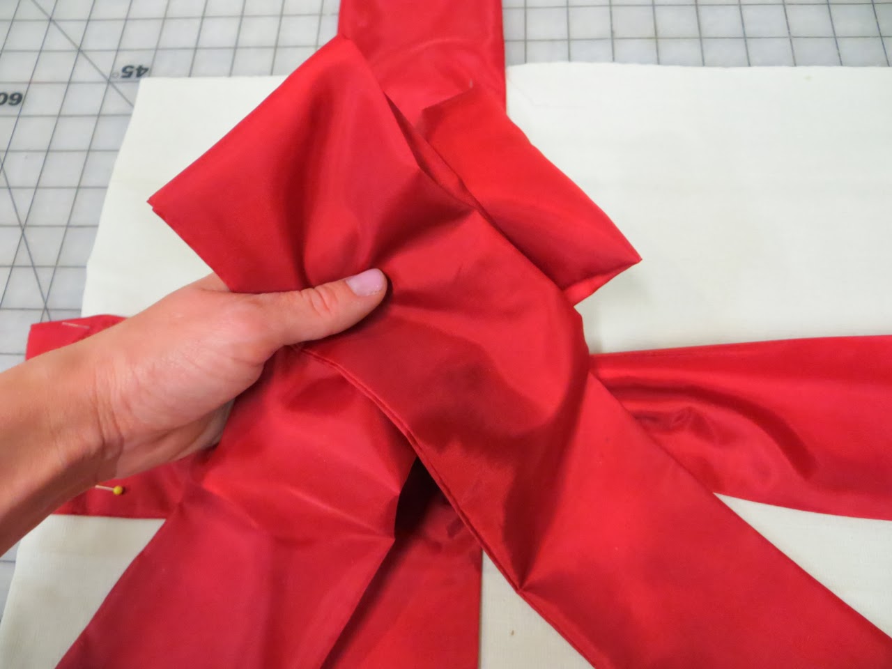 Lay your 19.5″ fabric square down with right-side up. Lay your short strip of bow fabric over your square about 11-inches up from the bottom edge. Adjust so your seam (from the first step) will be hidden under where the bow will be. Pin in place. Pin one of your strips (with finished end) 5-inches over from the left-side.. have finished end free and raw end hanging off your square about 3″. Pin your last strip (with finished end) 5-inches over from the left-side.. have finished end free and raw edge hanging off your square about 1″. Criss-cross your strips like photo above.