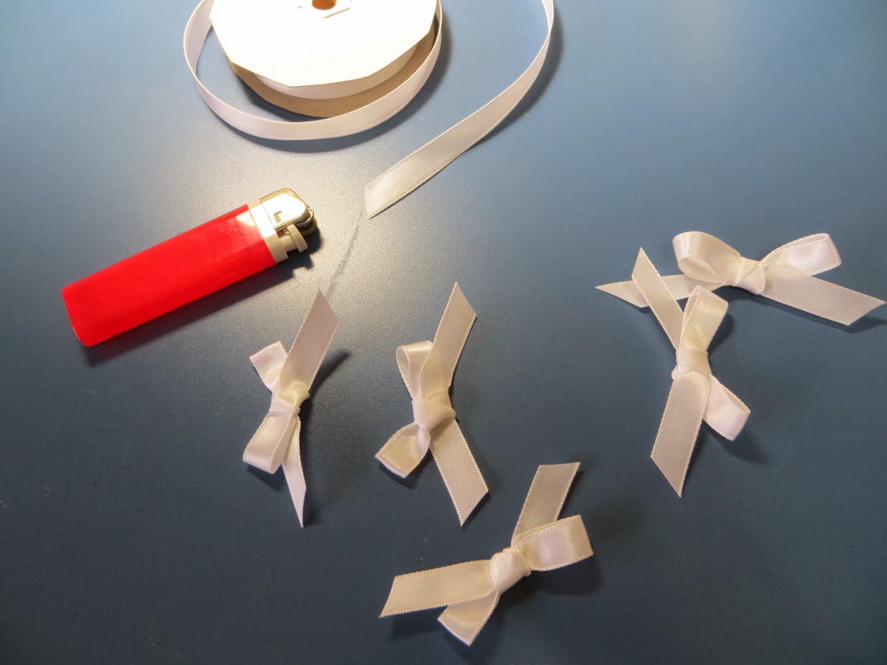 Tie 5 bows out of your ribbon and finish ends by heating with a lighter or candle flame.
