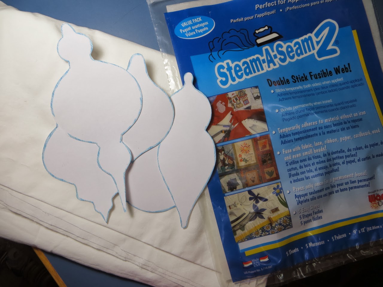Cut pattern pieces out. Peel backing off your sheet of double fusible web and place down onto your white cotton fabric and iron according to manufacture directions.