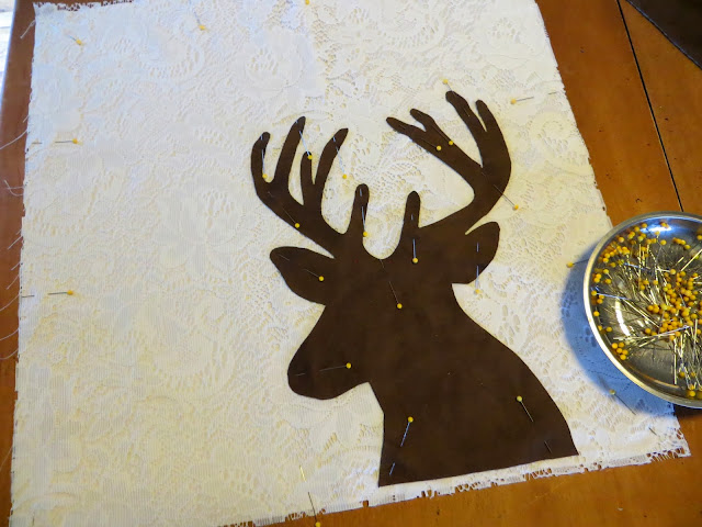 If you are using lace don’t forget to pin it over your regular fabric before pinning the deer on. Pin bottom edge of deer flush-to-1/4″ from bottom edge of square.