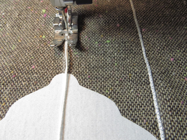 If you are using clear thread now is the time to use it (you just need it in the top of your machine). You’ll be stitching directly over your black crochet thread until you come to a light, then you’ll sew through the center of each light and reverse up and continue over your crochet thread to the next light.