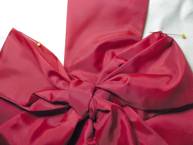 Next I lift up the bow where I want it to lay and place two pins in the center folds where my stitches will be hidden. Make your 3rd & 4th stitches here going through ALL layers (to make sure your bow ends down pull out).