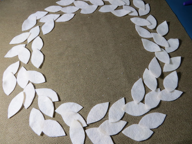 Cut leaf pattern out. I recommend transferring pattern to something stiff to make tracing easier. Trace pattern over one of your felt squares using a permanent marker – you need to fit them pretty tight to get at least 31 leaves on.