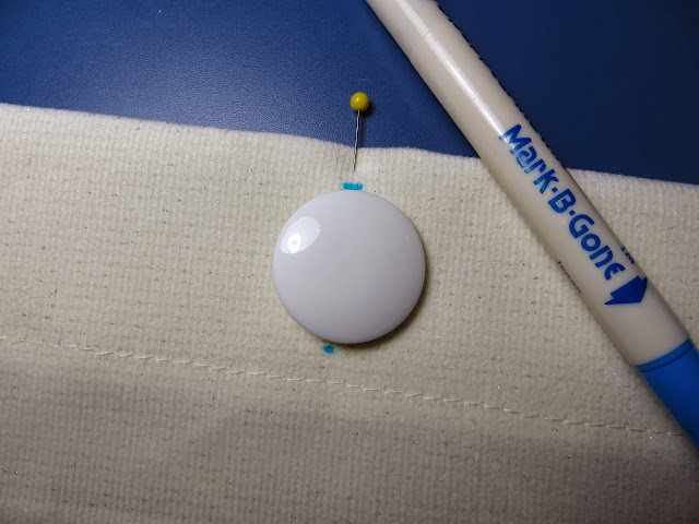 To find the center for your buttonhole, fold one of your back pieces in half and put a pin where it folds on your hem. Place your button over your pin and mark on the top/bottom for the correct size of buttonhole (I use an erasable fabric marker).