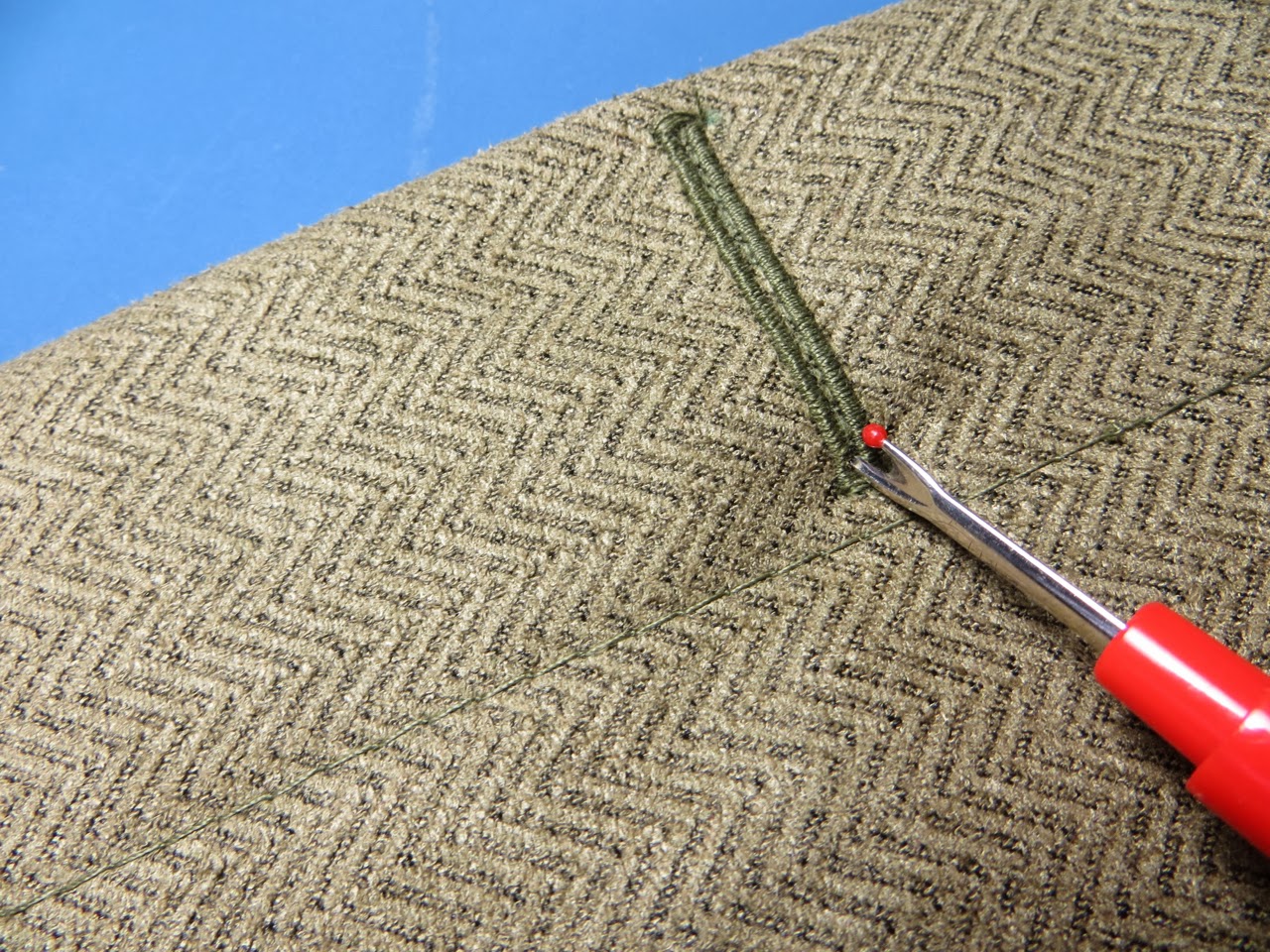 The first 2 stitches you will do are where you can see my pins in the photo above. These stitches will hold your vertical strip flat instead of wanting to scrunch up to one side.