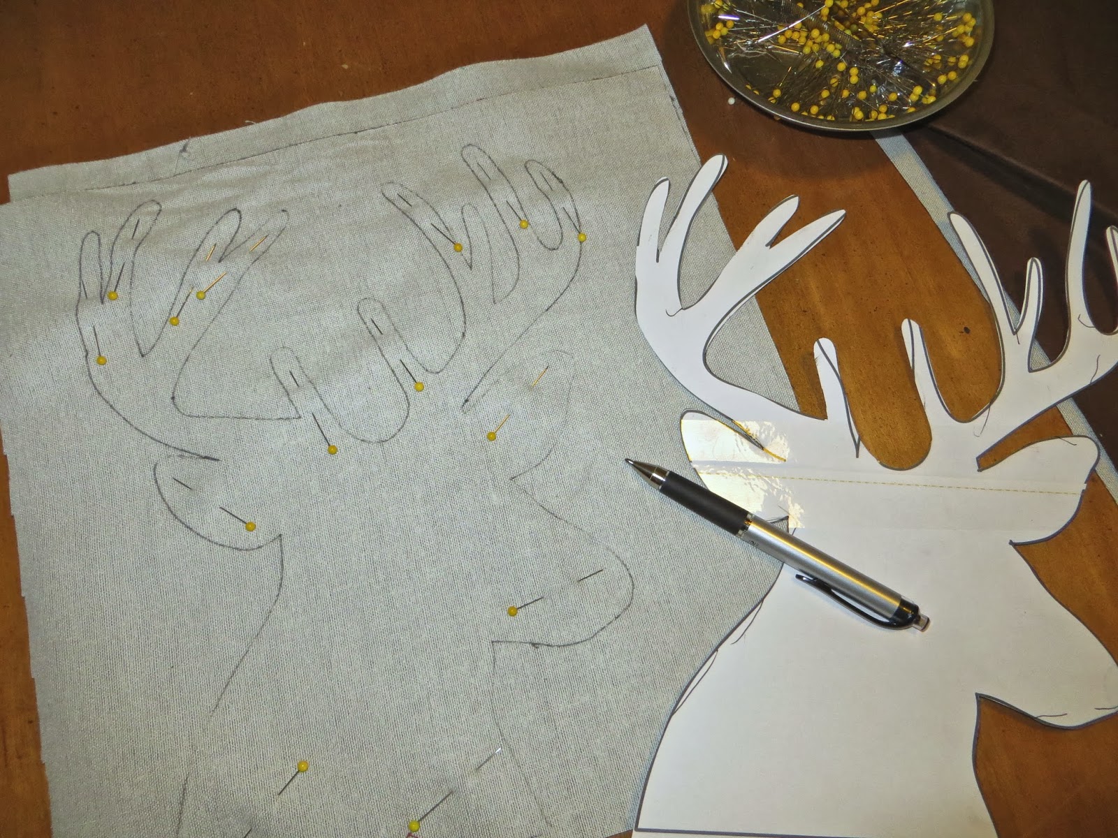 Trace your deer pattern on the wrong side or your brown fabric using a regular pen or pencil.  Cut out.  (I cut out 2 deer at the same time.. hence the pins )